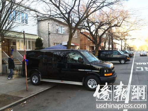 刘家门口已停了8部黑色厢式车接送亲友及战友。