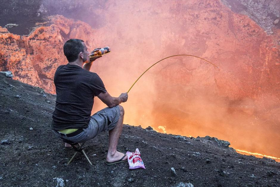 据英国《每日邮报》1月6日报道,瓦努阿图安布里姆岛火山,来自新西兰的冒险家Simon Turner为了能将此行变得更有意义,带着啤酒和棉花糖一同前往,“不要命”地坐在火山口旁,用帐篷桩勾着棉花糖,连着帐篷杆在火山口烤棉花糖吃。这里的岩浆温度高达2000多华氏度(约1093℃)。拥有丰富经验的火山专家拍摄下了Simon的疯狂行径。(网页截图)