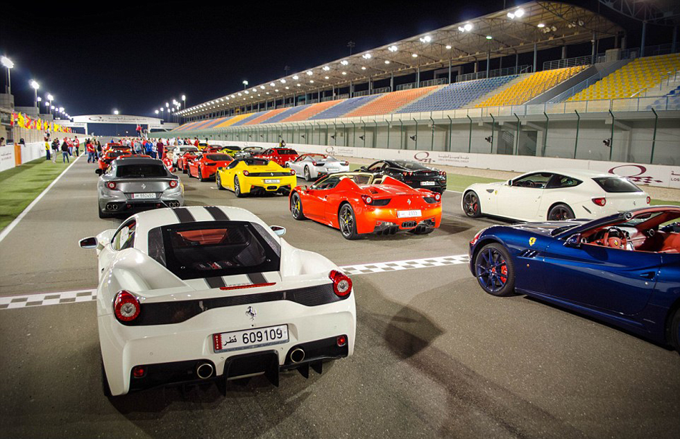 卡塔尔一处环形跑道上聚集的法拉利车队。(网页截图)