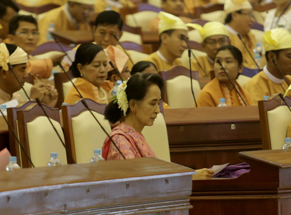 图:缅甸全民盟主席昂山素姬(前)2月1日出席第二届联邦议会人民院首次会议/新华社