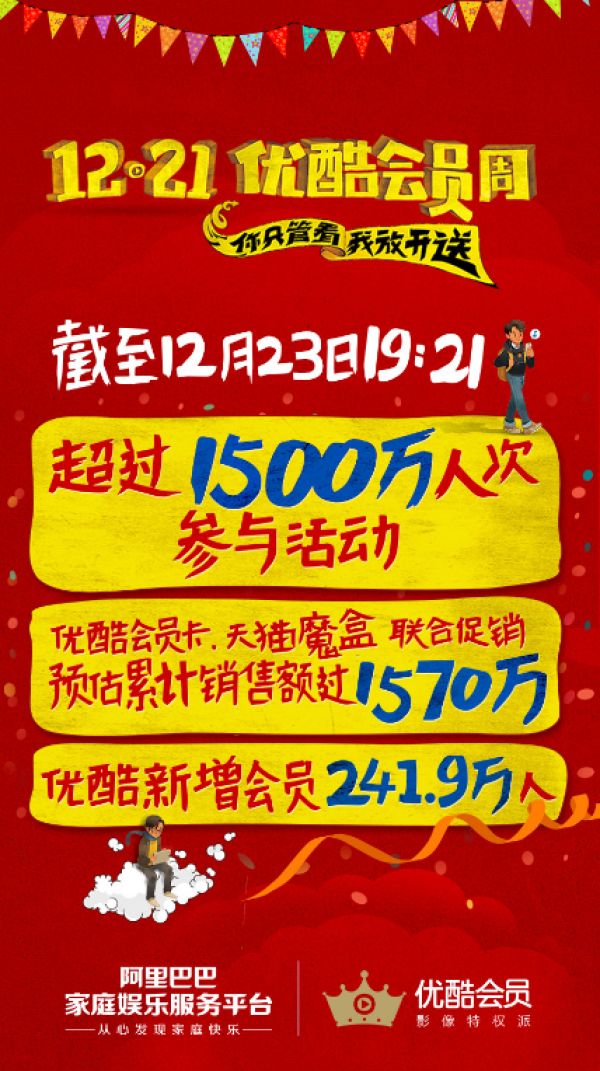 “优酷会员周”启动以来,12月21日至12月23日,福利连派3天,用户参与热情高涨。据统计,超过1500万人次享受到“优酷会员周”派发的福利,优酷新增会员241.9万人。优酷会员卡和天猫魔盒相互买赠的联合促销三天预计累计销售额破1570万。