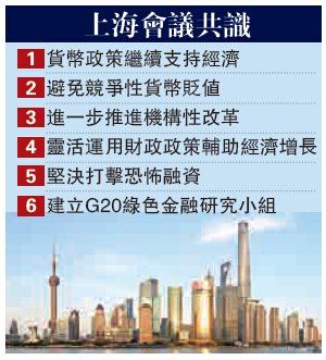 大公网2月28日讯 据中新社、凤凰网报道:二十国集团(G20)财长和央行行长会议27日在上海闭幕。这次会议达成了《G20财长和央行行长会公报》。公报称,近期市场的过度波动与全球经济基本面温和复苏的状况并不相符;未来各国将各自以及共同使用所有政策工具,包括货币、财政政策和结构性改革等,来应对风险、增强市场信心和促进经济增长;同时,将避免竞争性贬值,各国同意就外汇市场进行密切沟通,确保债务率保持在可持续的水平。