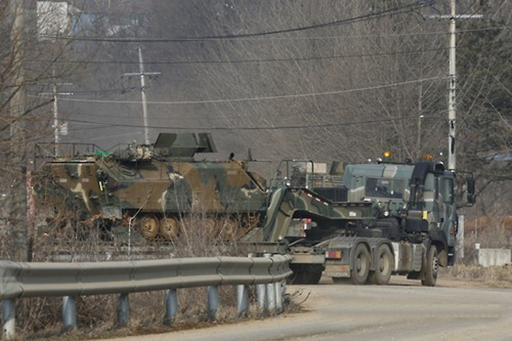图:韩国陆军K-200装甲车4日出现在京畿道涟川郡边境地区\韩联社
