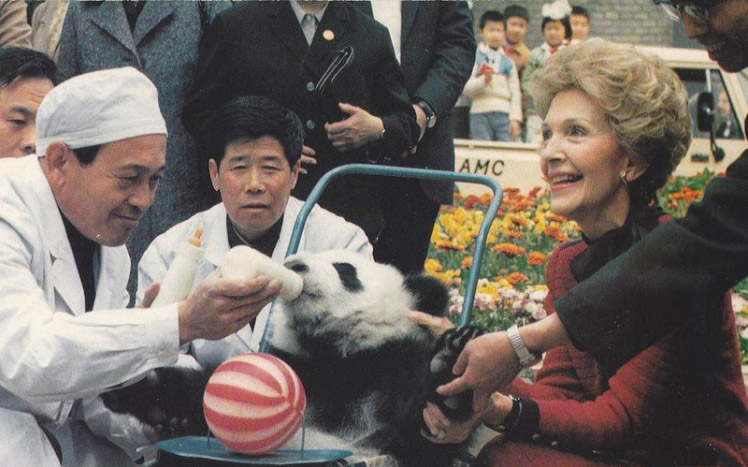 南希与中国也有一段缘分。1983年春天,四川省卧龙、蜂桶寨、九寨沟等自然保护区相继出现箭竹大面积开花枯死现象。箭竹是在这些地区生活的大熊猫的主要食物。断粮危机让珍贵的野生大熊猫处于生存险境。据了解,1984年4月,美国第40任总统里根和他的夫人南希应邀到中国访问。在北京动物园,南希捐出美国学龄儿童献出的1.3万美金和2辆吉普车,以支援生存受到威胁的大熊猫。