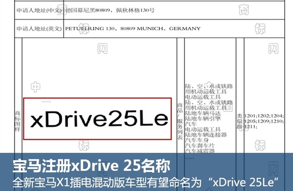 根据网通社从国家工商行政管理总局商标局获得的信息,宝马股份公司已在华注册了xDrive25Le商标。按照宝马新能源车型的命名体系,xDrive 25表示新车搭载的动力系统,Le则是指加长版插电式混合动力车,其中L是long version加长版,e则是eDrive的缩写,代表插电式混合动力。这将表明宝马将在全新X1加长版车型的基础上,推出一款插电混合动力车型同城活动,同时有望在年内正式上市。