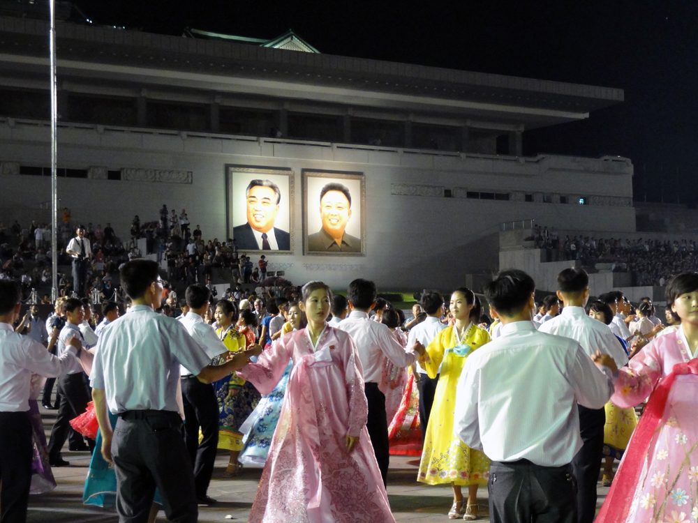 经过多番争取,男导游同意将我们升格。他向广场军官出示一张特别工作证后,立即获得礼遇,允许我们进入广场。只见5万多名大学生在炎夏穿着节日盛装,在广场上跳集体舞,从晚上7点跳到9点,个个汗流浃背。其间有20分钟的烟花表演,稀稀落落,毫无气氛。