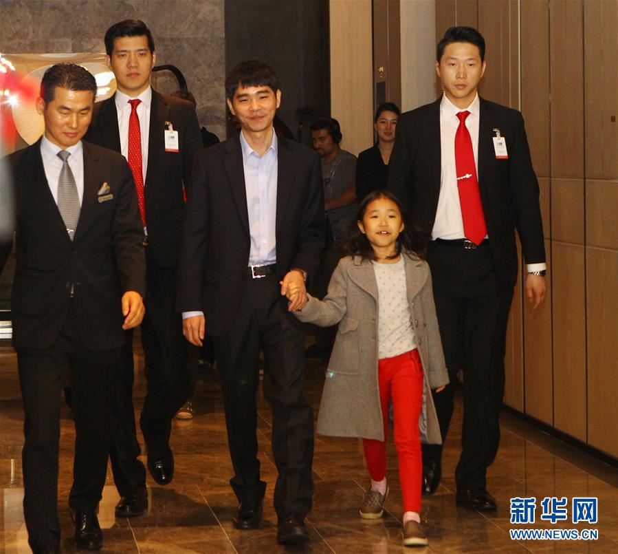 3月15日,李世石(左三)带着女儿(前右二)准备进入赛场。当日,韩国九段棋手李世石与阿尔法围棋在韩国首尔进行第五场对弈,但最终失利。新华社记者姚琪琳/摄