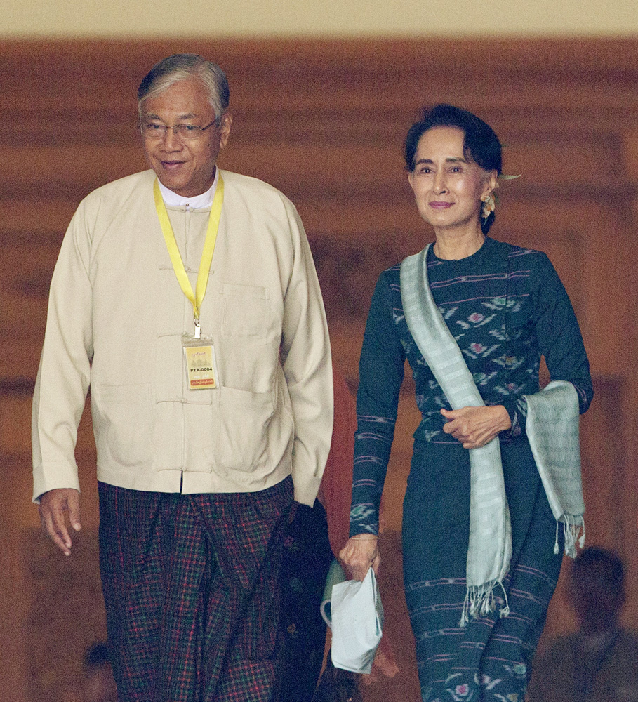 图:缅甸新总统廷觉(左)15日与昂山素姬一起步出议会/美联社