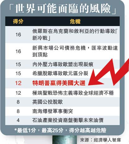 这份智库报告为全球面临的十大风险分别打分,最低1分,活动策划,最高25分,分数越高越危险。而特朗普当选美国总统获得12分,其风险甚至超过获8分的英国公投脱欧和南海爆发军事冲突,与极端恐怖主义震盪全球经济排名一样。