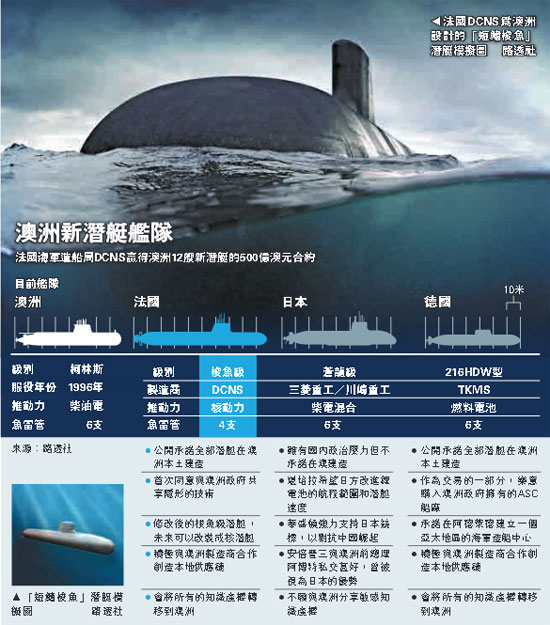 澳洲计划耗资500亿澳元,建造12艘新型潜艇,以取代即将在2026年退役的皇家澳洲海军科林斯级潜艇。日本和德国都曾就此项目竞标,在前总理阿博特执政时期,日方一直处于领先位置。