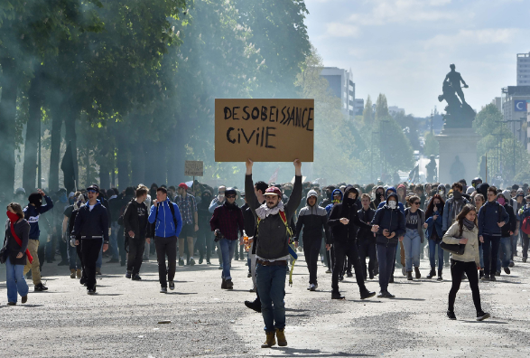 图:南特示威者28日高举写有公民抗命的纸牌\法新社