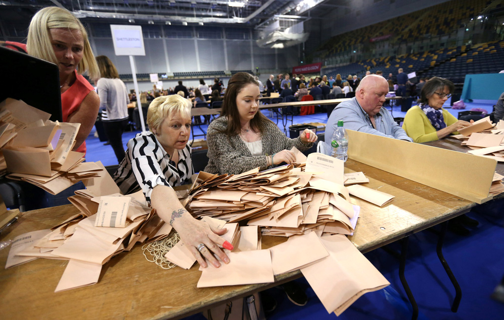 图:苏格兰格拉斯哥工作人员五日在点票\路透社