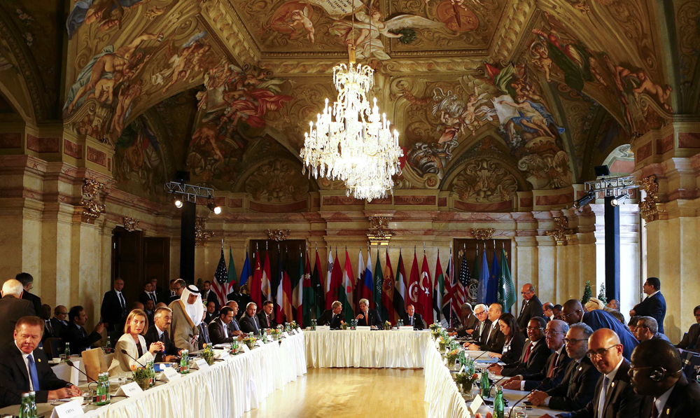 图:多国外长及国际组织代表16日在维也纳参加由美国和意大利组织的利比亚局势多国会议/美联社
