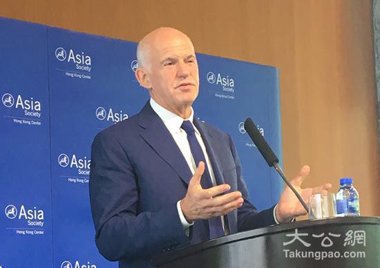 图:希腊前总理帕潘德里欧2日在亚洲协会香港中心发表演讲/大公报摄
