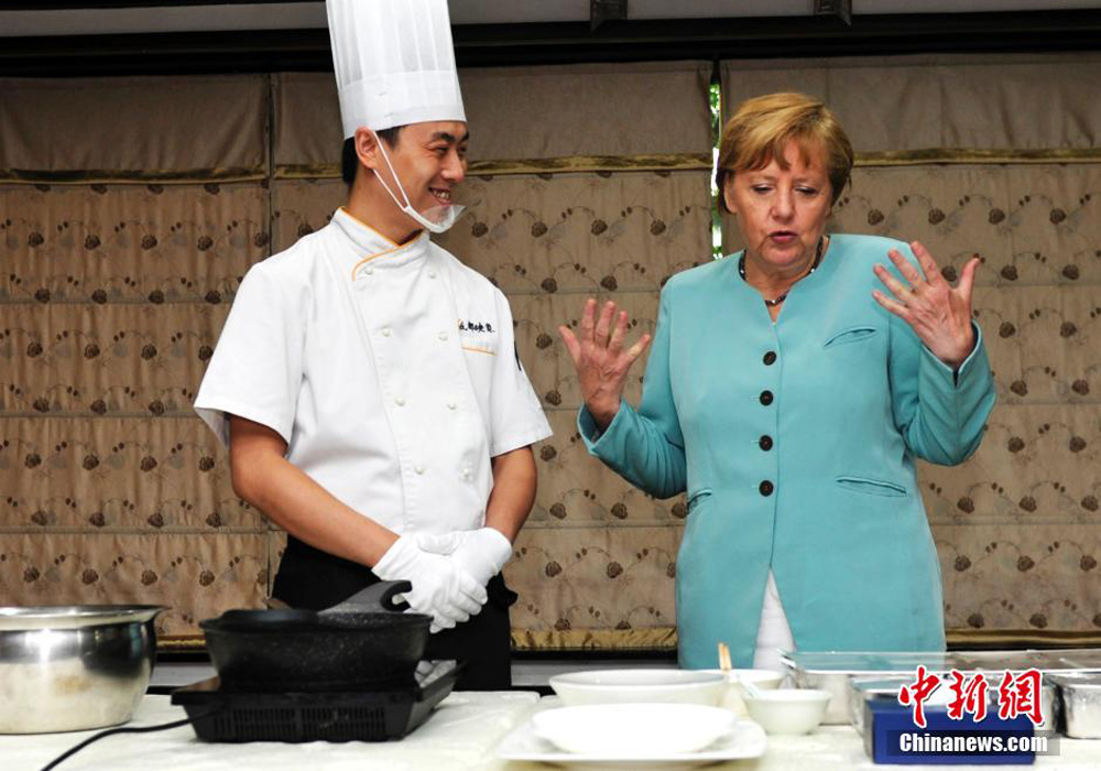 2014年7月默克尔访问四川省成都市,向川菜大厨学习宫保鸡丁的做法/资料图