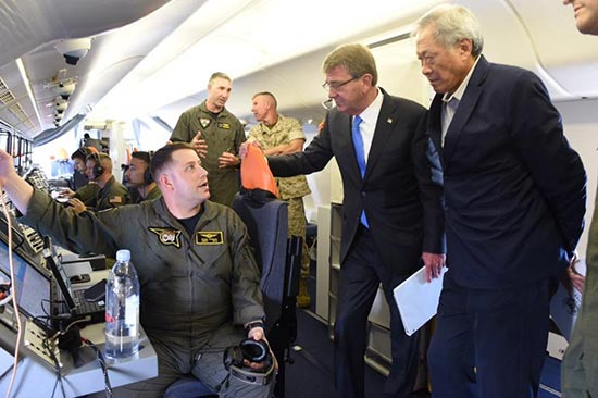图:美国防长卡特(右二)与新加坡防长黄永宏(右)登上P-8巡逻机/路透社