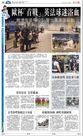 大公网6月11日讯 综合法新社、路透社及英国《每日邮报》报道:在恐袭阴云密布,工潮不见休止,垃圾堆积成山的情况下,周五在法国开始的欧国杯又迎来一个老大难的问题:足球流氓。就在开幕战前夕,英国球迷9日在南部城市马赛与当地球迷发生暴力冲突,导致两名球迷被捕,四名警员受轻伤,警方一度要施放催泪弹平息事态。