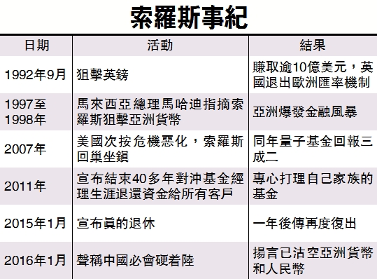 市传国际大鳄索罗斯重出江湖,腾祺基金管理投资管理董事沈庆洪相信,主要由于市场出现多个不明朗因素,为其带来有利的赚钱机会,包括英国举行脱欧公投,以及日本可能再加码量化宽松等。不过,目前美股及港股均重上一定的支持位,故只靠单一只基金的力量,不足以对环球股市带来巨大影响力,但要留意其他对冲基金是否相信索罗斯并参与做空。