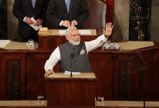 莫迪还展示了一把幽默感,调侃陷入僵局的美国国会政治。他表示,听说美国国会的工作进行得非常和谐,以两党合作闻名,美国议员们报以哄堂大笑。(在这方面)美国并不孤单,莫迪不忘揶揄本国议员们,我在印度议会见识了同样的合作精神,尤其是在上院。所以你们看,我们两国有很多相似的实践。美国议员们再次抚掌大笑。