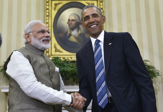 图:莫迪(左)周二在白宫与美国总统奥巴马举行会晤/法新社