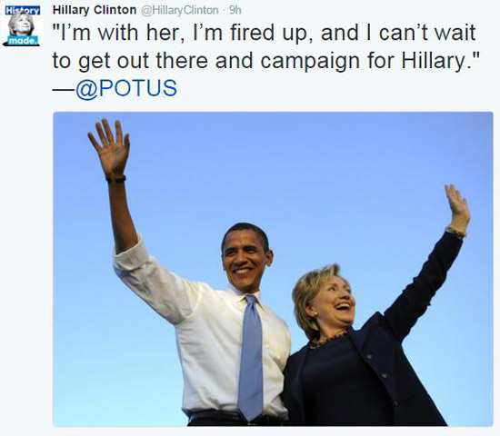 奥巴马当天上午在白宫会晤了民主党另一位总统参选人桑德斯,会晤结束后不久,希拉里竞选网站上就发布了这一份预先录制的长达3分15秒的视频。奥巴马在视频中说:我要祝贺希拉里·克林顿成为民主党的假定总统候选人,她创造了历史。他说,我不认为有其他人比希拉里更有资格入主白宫,她有勇气、有热情,并且有赢得总统选举的决心。奥巴马在说这些话时,背景画面展现了希拉里在担任国务卿期间,在多个关键时节或重要场合,希拉里与奥巴马并肩奋战的场景和图片。奥巴马还表示自己将与希拉里同在,迫不及待地想要与她共同战斗。
