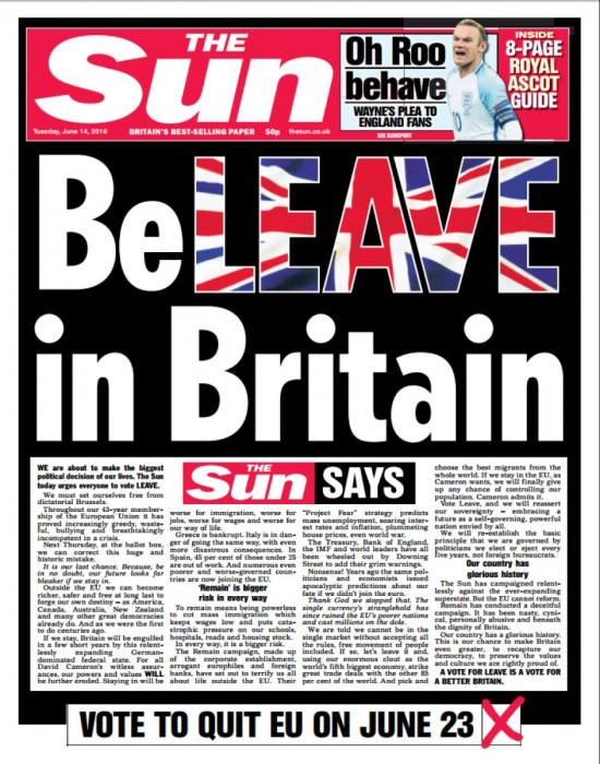 英国最畅销小报《太阳报》头版社论呼吁民众支持脱欧