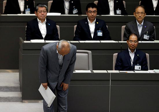 图:东京都知事舛添要一15日向东京都议会鞠躬下台/路透社