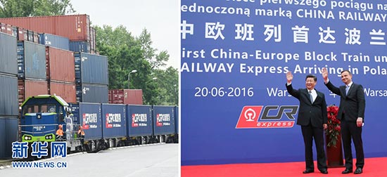 6月20日,国家主席习近平同波兰总统杜达在华沙共同出席统一品牌中欧班列首达欧洲(波兰)仪式。左图:带有统一标识的中欧班列鸣笛缓缓驶入站台;右图:两国元首向班列挥手致意(拼版照片)/新华社