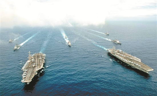 6月18日,美国海军斯坦尼斯号航母和里根号航母在菲律宾海展示武力。 网络图片