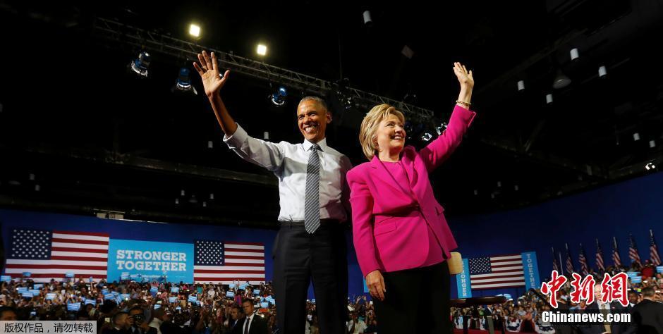 当地时间2016年7月5日,美国北卡罗来纳州夏洛特,美国总统奥巴马首次助阵民主党总统候选人希拉里的竞选集会。