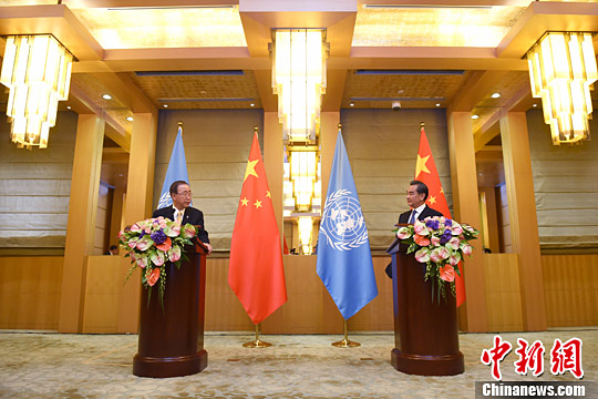 7月7日,中国外交部部长王毅在北京与来访的联合国秘书长潘基文举行会谈,会谈结束后双方共见记者并答问。中新社记者 侯宇 摄