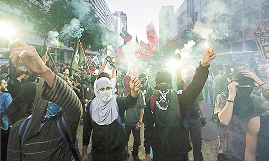 激进的黑衣蒙面人破坏巴士站和垃圾桶宣泄不满/美联社