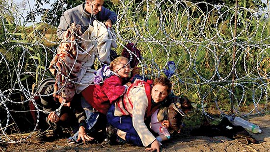 图:叙利亚难民穿过匈牙利边境的铁丝网/路透社