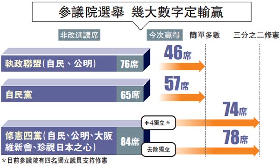 安倍在这次参院选举中低调处理修宪问题,将选战的焦点定为对其安倍经济学的公投。但是,反对派和政治评论员担心,安倍对修改和平宪法第9条的想法并没有改变,在修宪势力于两院都已达到三分之二门槛后,必须予以警惕。