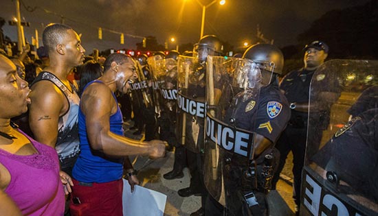 图:路易斯安那州示威者8日与全副武装的警察对峙/法新社