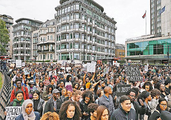 英国伦敦昨日有数百人上街示威,声援美国黑人,他们手持写有停止杀害我们(黑人)等标语。