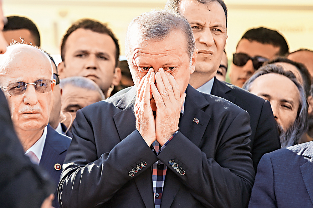 图:土耳其总统埃尔多安17日出席在政变中遇难者的丧礼,一度落泪/美联社
