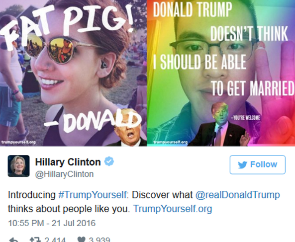 据Vox、美联社报道:当地时间7月19日,特朗普正式被美国共和党提名为该党派的总统竞选人。作为竞争对手的希拉里显然要在这个时候抓住一切机会来攻击他。日前,她就在推特和Facebook两大社交媒体平台上向特朗普发起了一场名为Trump yourself的攻击活动。希拉里想要藉此让民众了解这位竞争对手曾发表的一些争议性言论。