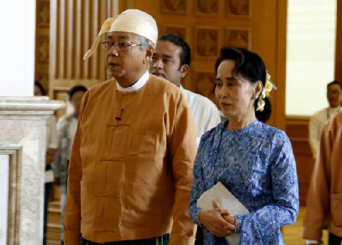 2016年3月30日,在缅甸内比都,当选总统吴廷觉(左)和全国民主联盟(民盟)主席昂山素季(右)抵达联邦议会会议现场。新华社发