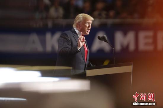 资料图:当地时间7月21日,在美国俄亥俄州克利夫兰举行的共和党全国代表大会上,共和党总统候选人特朗普发表演讲。中新社记者 廖攀 摄