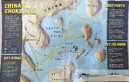 图:近期美国杂志《The Trumpet》所绘的中国在南海人工造岛并建军事基地的图片,以此渲染中国的军事威胁,为美国非礼通过制造藉口