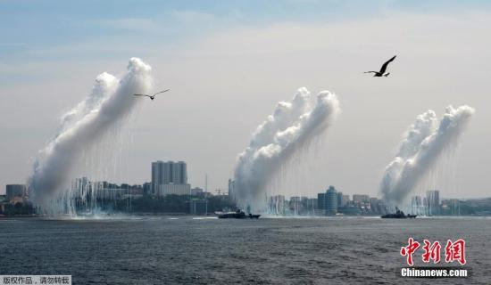 资料图:当地时间7月31日,俄罗斯波罗的斯克,俄罗斯波罗的海舰队参加俄罗斯海军节阅兵。图为俄罗斯军舰发射反导导弹。