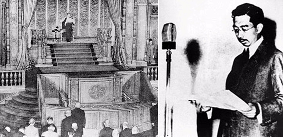 朕深鉴于世界大势及帝国之现状,欲采取非常之措施,收拾时局,兹告尔等臣民,朕已饬令帝国政府通告美.英.中.苏四国,愿接受其联合公告。