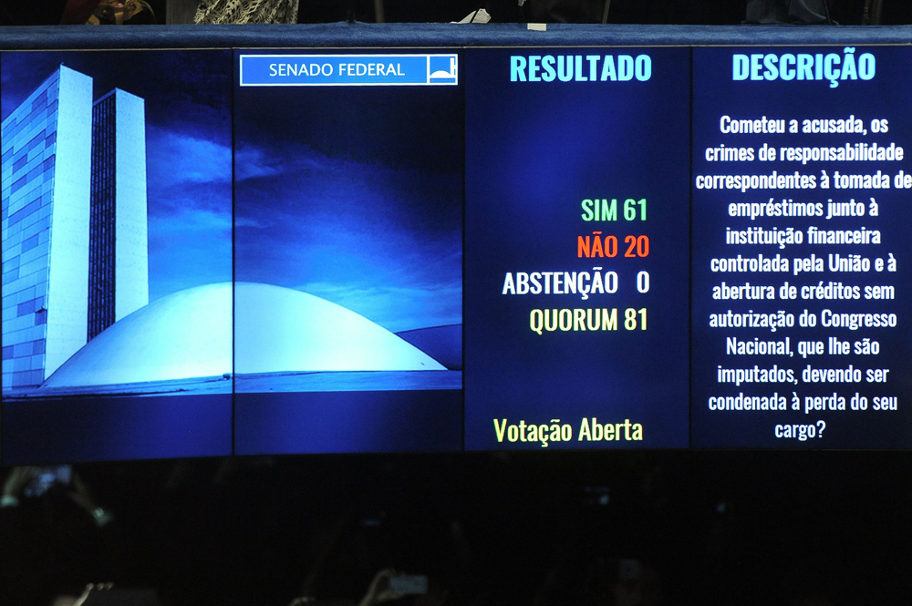 当地时间下午一点半,参议院经过16小时的马拉松辩论,在首轮投票中以61票赞成,20票反对,通过针对罗塞夫的弹劾案,她即时被罢免总统一职。依据最初规定,一旦通过弹劾案,罗塞夫也会被褫夺政治权利8年,但在她所属的劳工党议员的运作下,参议院把弹劾及褫夺政治权利分开投票,最后褫夺政治权利案获得42票赞成,36票反对,未到达三分之二的支持门槛而被否决。这意味着罗塞夫保留了竞选公职的权利,有机会东山再起。