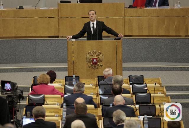 4月19日,在俄罗斯首都莫斯科,俄罗斯总理梅德韦杰夫在国家杜马(议会下院)作政府工作报告。(新华社/美联)