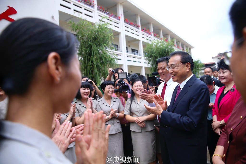 李克强在万象寮都公学参观,并同学校师生亲切交流。 图:央视新闻