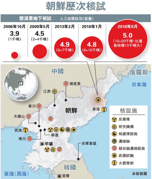 大公网9月10日讯 综合法新社、英国BBC网站及路透社报道:朝鲜国庆68周年之际,9日上午发生里氏5级人工地震,韩国方面推测地震由地下核试引起。数小时后,平壤宣布第五次核试取得成功。韩国军事官员表示,这是朝鲜历来最大威力核试,威力比今年1月的核试大两倍。专家估计,此次爆炸当量为1万至3万吨黄色炸药(TNT),超过当年广岛原爆的1.5万吨当量。