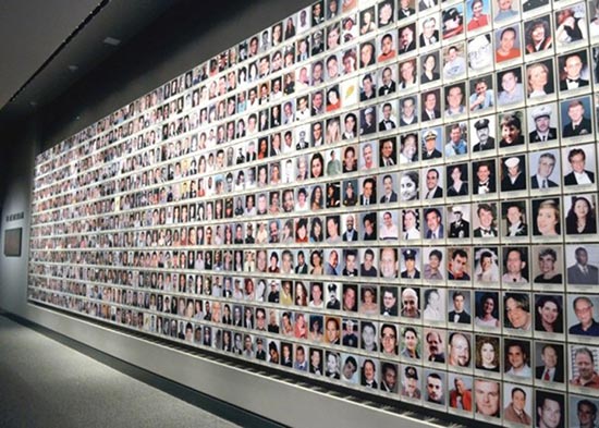 9.11纪念博物馆内有一处巨大画廊,挂上近3000幅5寸乘7寸的死者遗照,除了有三名死者家属希望保留私隐而没有提供照片外,博物馆职员尝试多年都未能为剩下的七名死者补上照片,只能以一块白橡木的树叶代替。