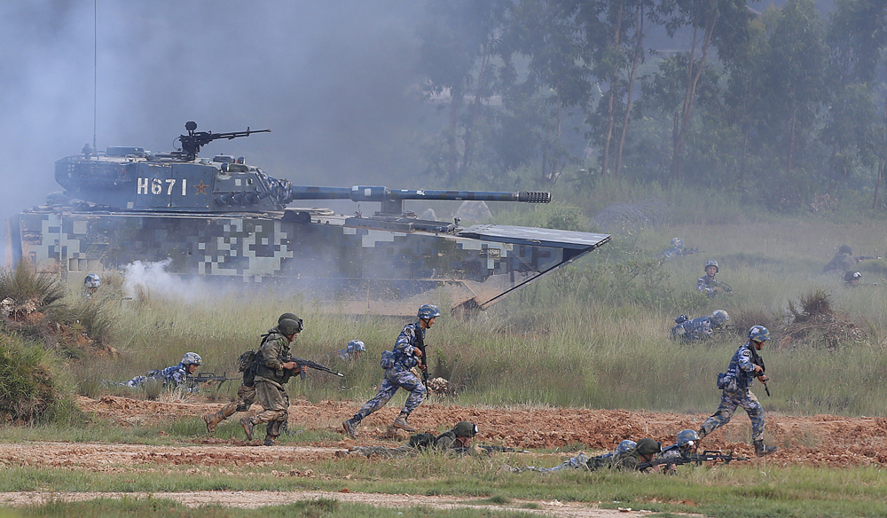 图:9月14日,中俄海军陆战队混编陆战分队对岛礁防御之敌,进行进攻战斗战术综合演练 新华社