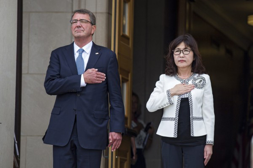 图:日本防卫大臣稻田朋美(右)15日与美国国防部长卡特会面 网络图片